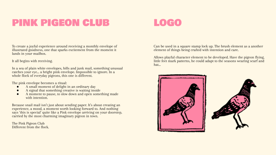 The Pink Pigeon Club is a monthly snail-mail art subscription created by two friends in the UK and Cyprus who share a love of storytelling through illustration. Each month, they hand-design and pack a unique themed collection of prints, stickers, and creative surprises, bringing a little handmade joy and whimsy straight to your letterbox.