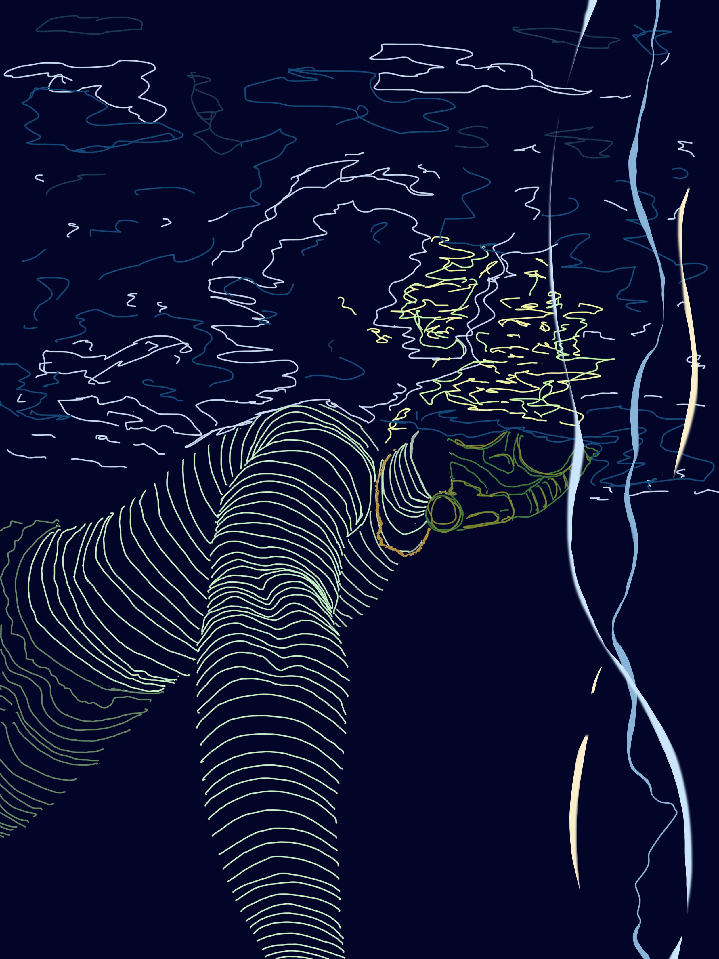 This multiscreen work explores a way of visualising and mapping these intangible, inaccurate human memories and how Deep Learning AI software can interpret them. Through the use of contoured style digital illustrations, a memory of snorkelling on holiday in Padang Bai, Bali has been captured. Prominent to the memory were colourful reflections dancing along the ripples under the water’s surface and the beams of light reflecting onto the subject, who is depicted in the image. The image is processed by a Deep Learning software called ArtBreeder, in which it recreates and generates a whole new still image. By controlling the genes of the software, 175 images were produced by the algorithm. Through capturing and blending each image, a reinvented artificial memento was created.